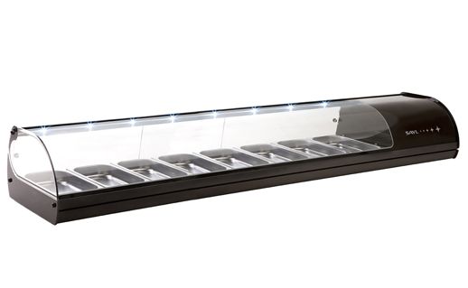 Diseño contemporáneo para la vitrina de tapas de toda la vida.Disponible en 5 colores: Negro, argenta, rojo, blanco, y ébano.Cristal templado.Iluminación High Power Leds de luz fría y mínimo consumo.Posibilidad de cuba