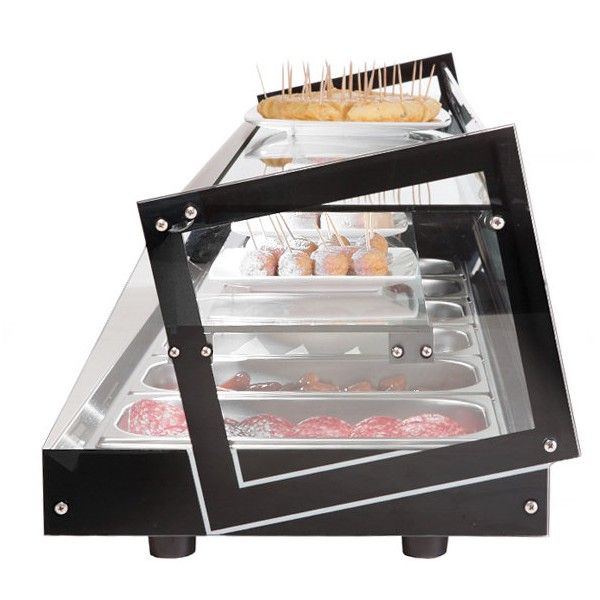 Termostato electronico ajustable que incorpora un sistema de seguridad con lectura digital constante. Provista de desagües, cuba sin ángulos que facilita la limpieza. Puertas correderas. Cubierta de cristal vitrificado resistente a golpes. Conserva los alimentos entre 1ºC y 5ºC. sistema exclusivo para la extracción del cristal delantero sin necesidad de herramientas. Sistema especial de difusion uniforme del frío.
